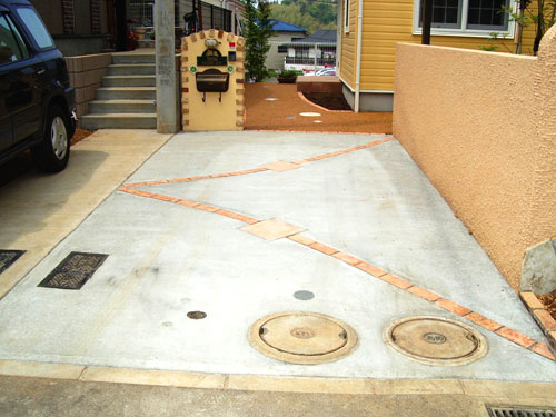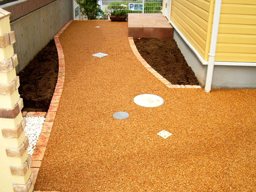 アプローチは、滑り止めと明るさを出すために樹脂で固まる砂利を敷き、お客様がご用意したタイルを中間に入れました。