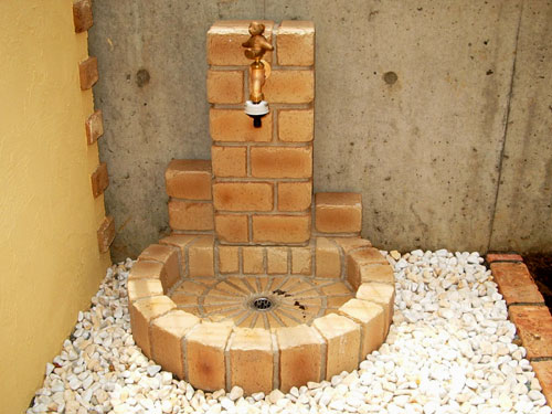 門柱裏の立水栓は既製品の蛇口を変え、周りに色つきの砂利を敷き詰めて明るさと可愛らしさを演出しました。