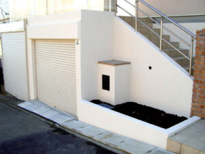 門柱裏の立水栓は既製品の蛇口を変え、周りに色つきの砂利を敷き詰めて明るさと可愛らしさを演出しました。